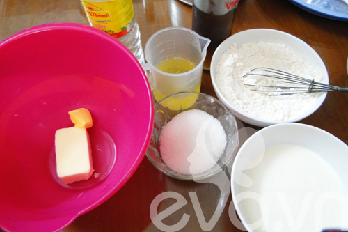 - 55g bơ nhạt- 100g đường trắng- 2 lòng trắng trứng (70g)- 1 thìa cà phê vanilla extract- 125g bột mỳ đa dụng- ½ thìa cà phê bột nở (baking powder)- ¼ thìa cà phê muối nở (baking soda)- 160 ml buttermilk (thay bằng 160 ml sữa tươi + (1+ ¾) thìa cà phê dấm trắng)
