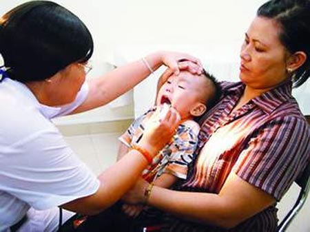 Khám họng cho trẻViêm V.A mạn tínhViêm V. mạn tính hình thành do viêm V.A cấp không được điều trị đúng.Viêm V.A mạn tính thường xuất hiện ở trẻ dưới 6 tuổi với các biểu hiện:- Ngạt mũi thường xuyên, ngày càng tăng.- Chảy dịch ra cửa mũi trước.- Trẻ hay ho và sốt vặt, do mũi chảy xuống họng và mủ đọng ở hốc mũi.- Trẻ biểu hiện ngủ không yên giấc, ngáy to, giật mình.- Tai nghễnh ngãng và cũng dễ bị viêm.- Cơ thể trẻ chậm phát triển so với lứa tuổi, kém nhanh nhẹn, ăn uống ít biết ngon. Người gầy hoặc béo bệu, nước da trắng bệch.Tiến triển bệnhViêm V.A mạn tính không điều trị kịp thời, trẻ thiếu thở dẫn đến hiện tượng thiếu oxy mạn tính, hình thành bộ mặt V.A: da xanh, miệng há, môi trên bị kéo xếch lên để lộ răng cửa vẩu, răng hay mọc lệch, môi dưới dài, thõng, đôi mắt mở to, trẻ có vẻ ngây ngô.Ngoài bộ mặt V.A, trẻ còn có những biến dạng ở thân mình: lồng ngực bị dẹt, hẹp bề ngang, lưng bị cong, vẹo hoặc gù, bụng ỏng, đít teo.Về mặt tinh thần, những trẻ này thường không tập trung tư tưởng, lười biếng, buồn ngủ, trong lớp trẻ hay học kém do trẻ nghe kém nên không hiểu những lời giảng của giáo viên, không thấy hứng thú trong học tập.Sự phát triển trí tuệ ở một trẻ bị viêm V.A cũng hạn chế do nghe kém và thở kém làm giảm lượng oxy cung cấp cho não trẻ.Tiên lượng bệnh không nặng nề nếu trẻ được điều trị viêm V.A mạn tính trước khi để lại di chứng.Viêm amiđanViêm amiđan là nhóm bệnh hay gặp, đứng hàng đầu trong những bệnh lý về họng. Bệnh tiến triển có thể cấp tính hay mạn tính. Viêm amiđan rất hay tái phát và có thể gây các biến chứng nguy hiểm.